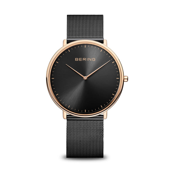 Bering | Ultra slim black and rose gold 39mm dial milanese | 15739-166